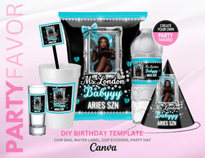 Create your own Trendy Birthday SZN Party Bundle! Personalize your own chip bag, Styrofoam cup sticker, shot glass sticker, party hat water label and drink stir stick! Edit by yourself or grab a friend to assemble your party favors! Our supply list is included so you can quickly get started! Once you master this set you can create sets for your family & friends like a pro!