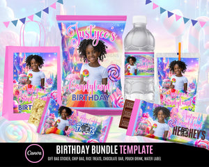 Candyland Birthday bundle Templates! Includes birthday chip bag, candy wrapper and water label digital files for you to edit, download and assemble at home!