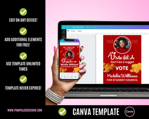 Edit this poster today for your homecoming election! Edit and download within minutes! Print at home or at your local shop!