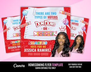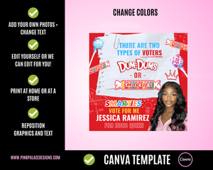 Edit this dum dums and smarties flyer today for your student election! Edit and download within minutes! Print at home or at your local shop!