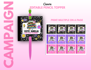 Edit this Pencil Topper today for your homecoming election! Edit and download within minutes! Print at home or at your local shop!