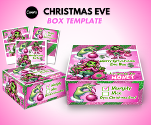 Get ready to add a festive twist to your girls' night out with this Girls Night Grinchmas Box Template! Perfect for creating a memorable holiday gathering, this editable Canva template lets you customize your own unique Grinch-themed box. Featuring high-quality, adorable graphics with a girly flair, this template is designed for an 8" x 8" x 4" box—perfect for gifts, goodies, or holiday surprises!