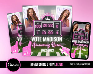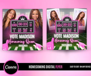 Homecoming is here and it's time to vote for the queen and it's you! This digital flyer and sms flyer is easy to edit on any device. Edit, download and simple post to your social media or print and hand out! Need assistance? Send your information and we will edit for you! Fast turnaround❤️