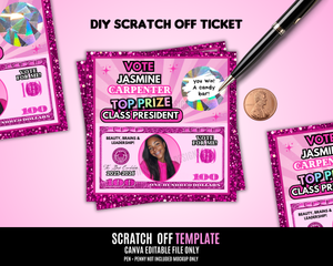 Edit this scratch off card today for your homecoming election! Edit and download within minutes! Print at home or at your local shop!